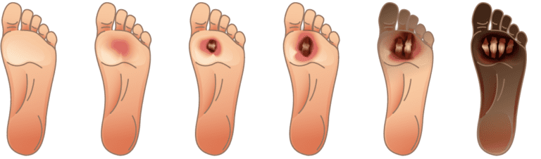 گروه چهارم: بیمارانی که در معرض خطر شدید هستند. این افراد حسی در پا نداشته و سابقه زخم قبلی در پا .دارند. این افراد هر یک تا دو ماه باید به کلینیک پای دیابتی مراجعه نمایند.